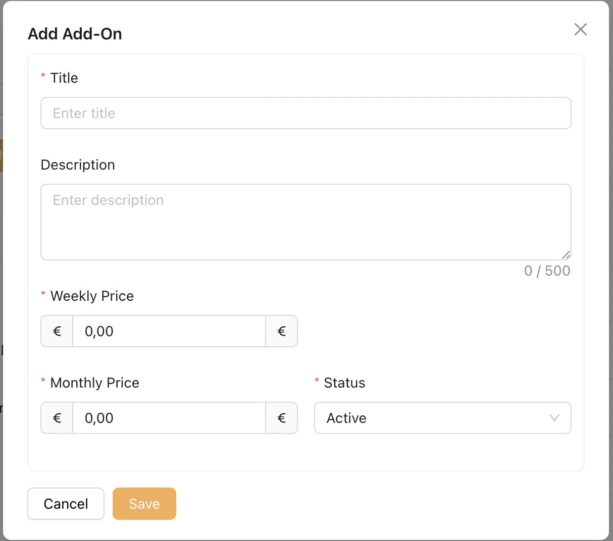 - Status: Defines whether the Add-On is Active or Inactive. Only Active Add-Ons will be available for selection in JSales.