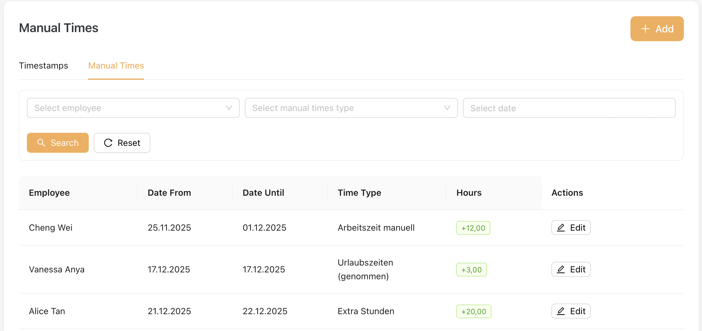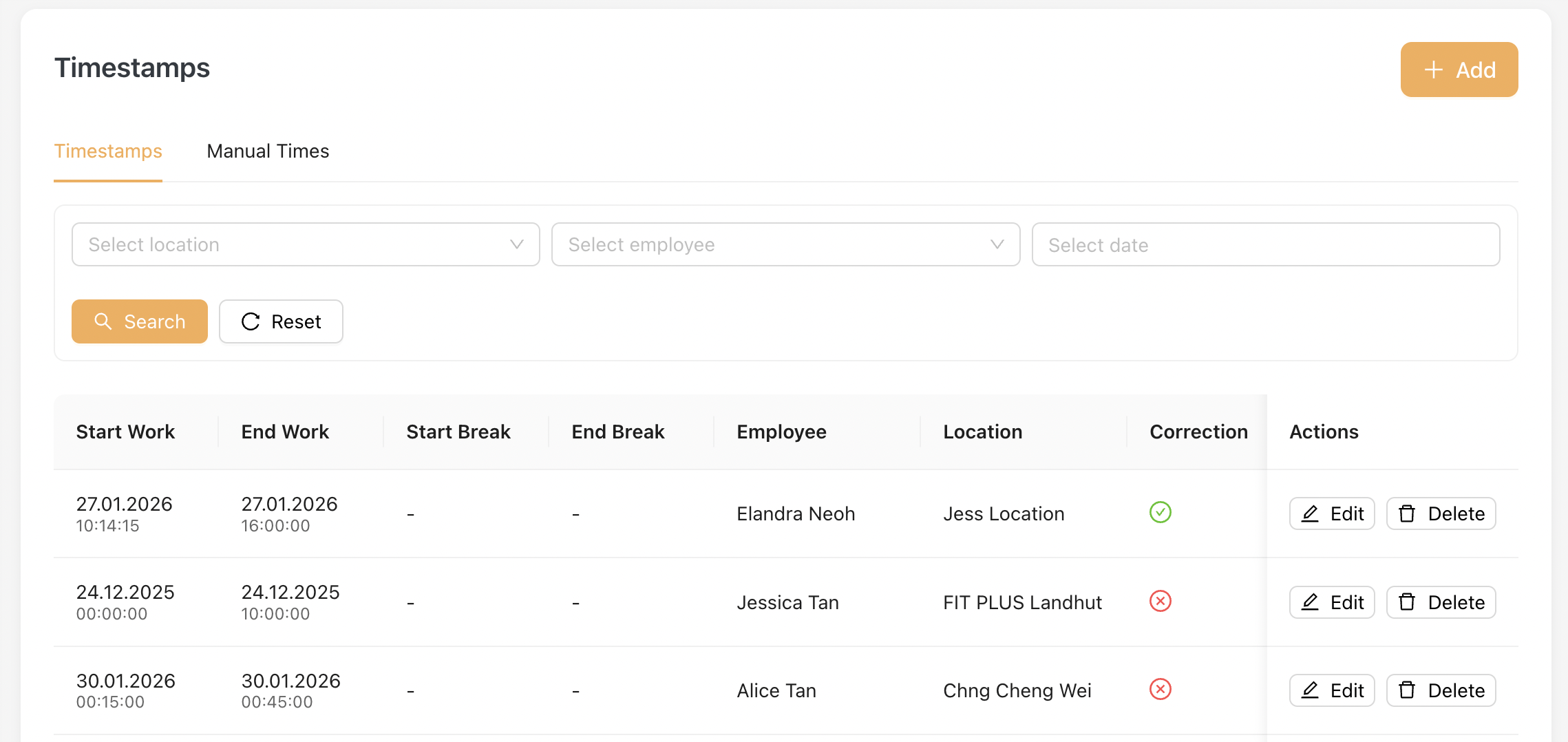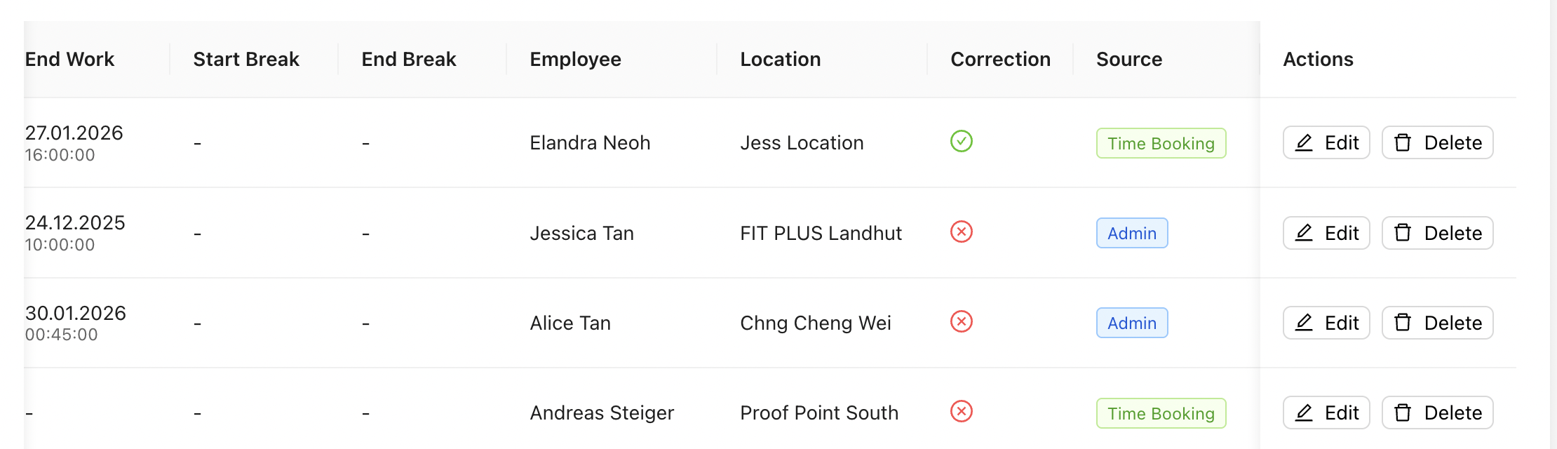 The Times module displays all time booking records, whether they are booked by employees via the Time Booking panel or manually created by Admin within this module. It allows Admin to monitor each employee’s daily time booking records, add, edit, or remove manual time entries, and review or correct time records when warnings are triggered due to suspicious or invalid entries.