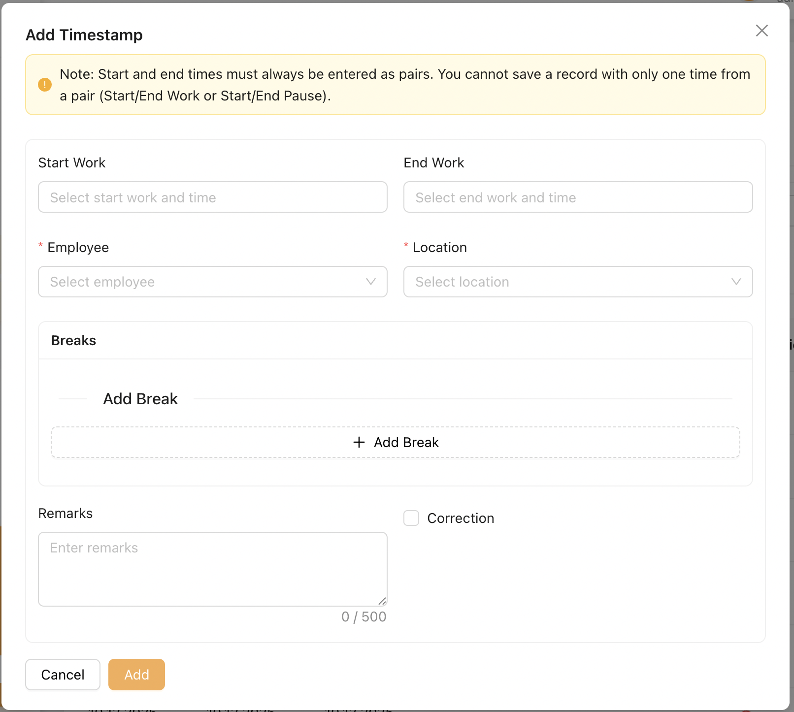 • Add Breaks: Admin may add multiple breaks within the same shift for the employee