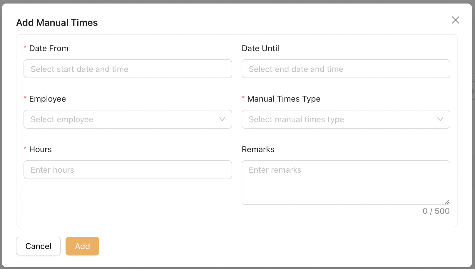 Manual Times refer to work or absence hours that can be manually entered into the system by Admin. These values either add to or deduct from the Total Working Hours, directly affecting payroll calculations. By default, the system provides Vacation and Sick Leave manual time types.